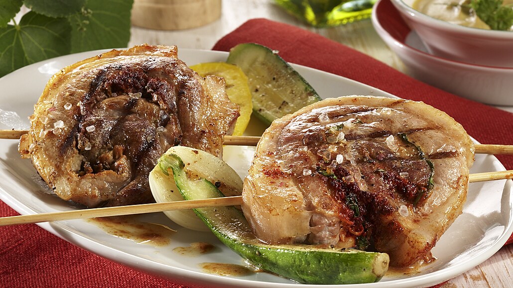 - Roládu rozkrájíme na plátky. Závitky napříč napícháme na navlhčené špejle nebo kovové jehly. Pečeme na rozpáleném grilu asi 30 minut, špízy během grilování otáčíme.