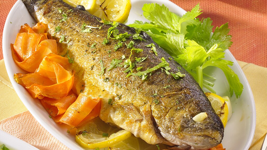- Pečené pstruhy vyjmeme z alobalu a rozdělíme na talíře. Posypeme je nasekanou jarní cibulkou, obložíme plátky citronu, čerstvou zeleninou a podáváme s česnekovým dipem.