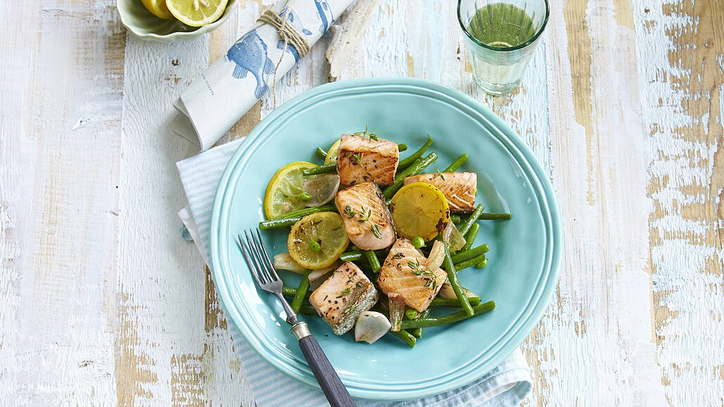 - Citron omyjeme a nakrájíme na plátky, kterými poklademe lososa. Vše osolíme, opepříme a poklademe čerstvým tymiánem.
