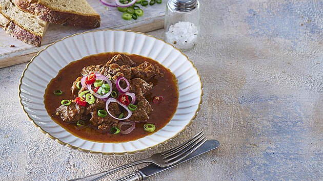 - V případě, že nemáme pomalý hrnec, dáme vše do kastrolu s poklicí a pomalu dusíme v troubě předehřáté na 100°C. Hotový guláš dochutíme rozestřeným česnekem. Podáváme s chlebem nebo s knedlíkem. Vršek můžeme ozdobit nakrájenou červenou cibulí, jarní cibulkou a feferonkou dle chuti.