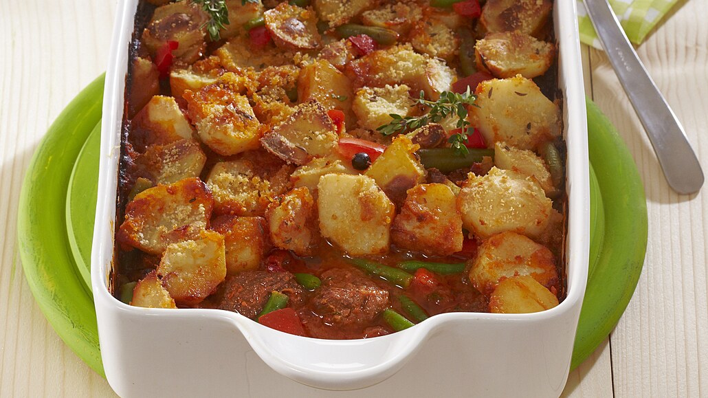 - Guláš vyjmeme z trouby, přilijeme 250 ml vody a smetanu, přidáme fazolky a papriky. Navrch rozložíme brambory, osolíme je, opepříme, posypeme strouhankou a poklademe kousky másla. Guláš zapékáme při stejné teplotě asi 50 minut dozlatova.