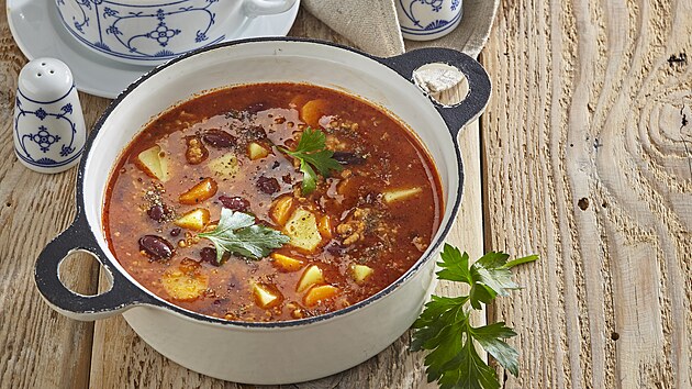 - Do směsi přimícháme vločky, brambory nakrájené na kostky a mrkev na kolečka. Zalijeme vývarem, aby byl základ ponořený. Osolíme, přidáme majoránku a kmín. Vaříme asi 15 minut.