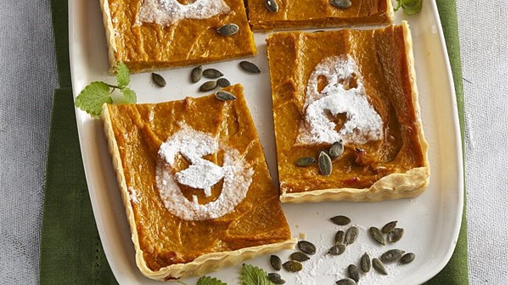 - Po upečení odstraníme papír s fazolemi, na těsto nalijeme dýňové pyré a pečeme dalších 20 minut. Pak stáhneme teplotu na 160 °C a pečeme ještě 15 minut.