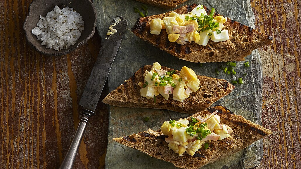- Vychlazený hermelín a šunku nakrájíme na kostičky o velikosti asi 1/2 cm (můžeme je i nahrubo nastrouhat). Šalotku a vejce oloupeme a nakrájíme nadrobno. Pažitku opláchneme a nasekáme.