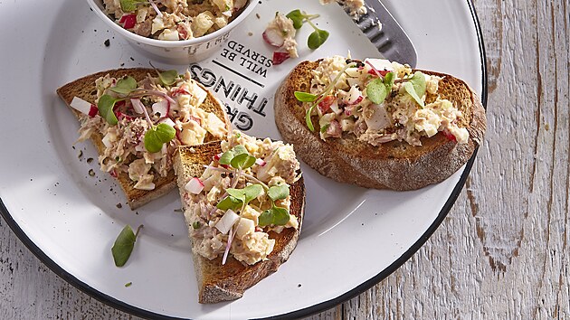 - Chleba na sucho opečeme v toustovači, pomazánkou pomažeme topinky a podáváme posypané klíčky z ředkviček.