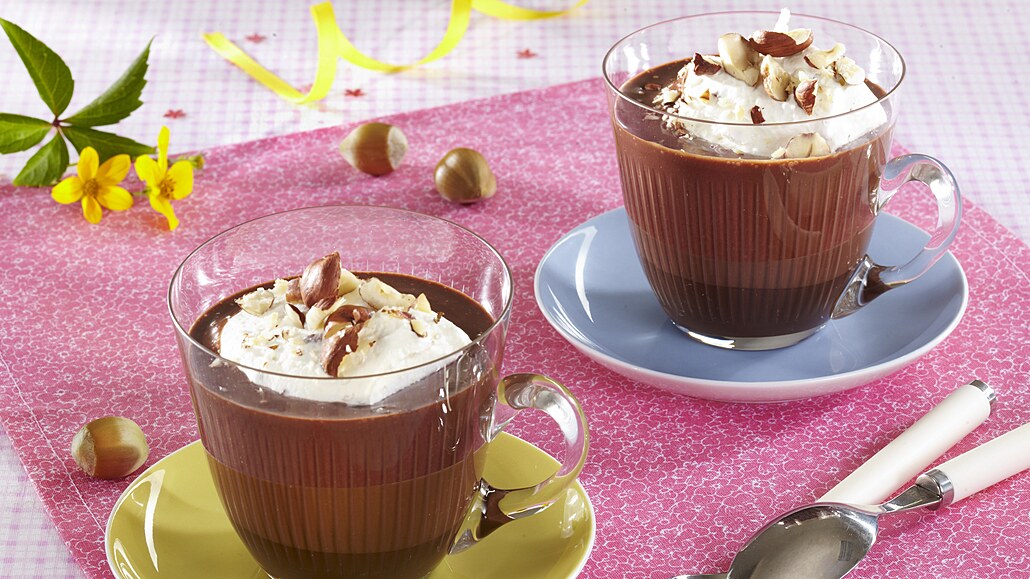 - Čokoládový nápoj rozdělíme do šálků, ozdobíme nočkem oříškové šlehačky a hustě posypeme zbylými oříšky.