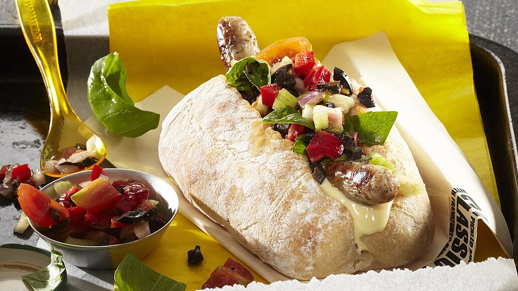 - Bagetky rozkrojíme. Do každé dáme trochu ochucené majonézy a dvě klobásky. Navrch přidáme lžíci olivové salsy.