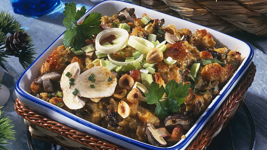 - Houby nakrájíme na větší kousky, vložíme do hrnce s vroucí osolenou vodou a necháme asi minutu přejít varem. Scedíme je, necháme okapat a dáme do větší mísy. Přidáme na kostičky nakrájenou veku. Vejce rozšleháme s mlékem, solí, pepřem a špetkou kari koření a nalijeme na veku. Přisypeme lískové oříšky, pórek nakrájený na tenká kolečka a vče důkladně promícháme.