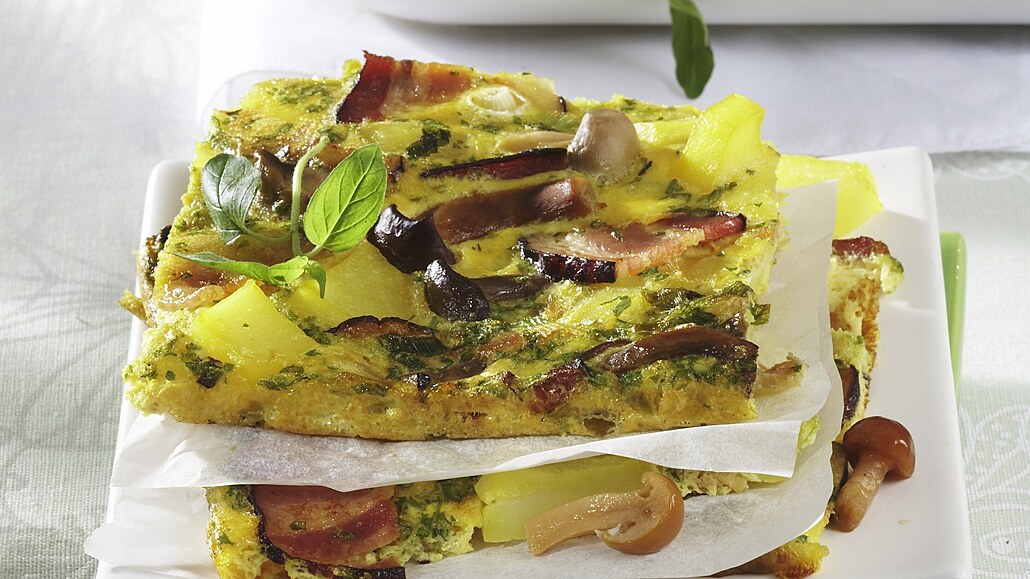 - Pekáček vymažeme tukem, vlijeme do něj připravenou směs a dáme péct do trouby vyhřáté na 190 °C. Pečeme dozlatova asi 10-15 minut. Upečenou omeletu rozkrájíme na čtverečky.