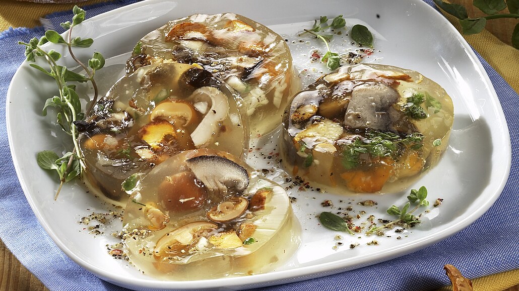 - Želatinu připravíme dle návodu na obalu. Teplou ji nalijeme do hrnce s houbami. Vše zlehka promícháme.