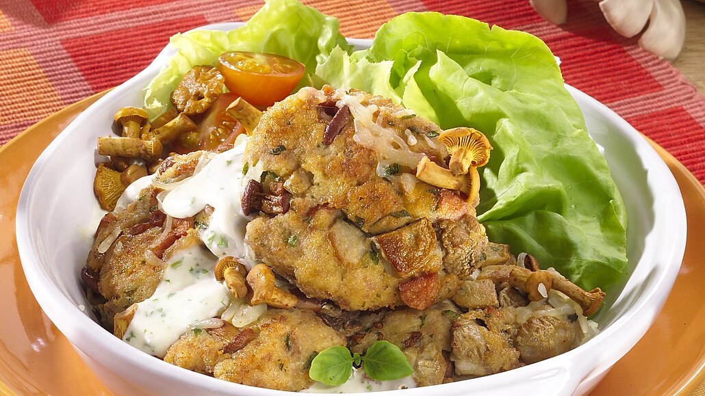 - Housky namočíme do vody a necháme nasáknout. Pak je jemně vymačkáme a přidáme do houbové směsi. Vmícháme vejce, sůl a pepř a důkladně rukama prohněteme.