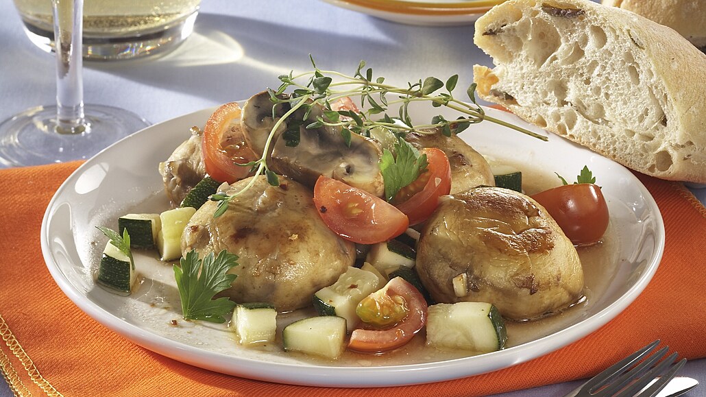 - Přidáme nakrájenou cuketu, podlijeme vínem a přidáme rajčata a tymián. Dochutíme pepřem a solí, přiklopíme a dusíme asi 10 minut. Měkké houby posypeme nadrobno nasekanou petrželkou a podáváme s bílou bagetou.
