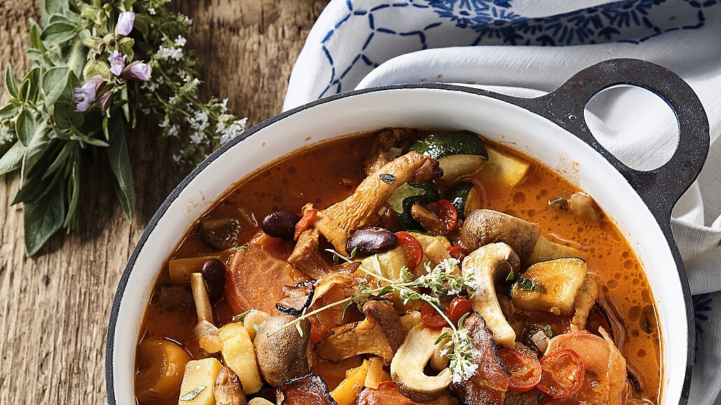 - Poté přidáme rajčata, přiklopíme pokličkou a dusíme doměkka. Nakonec vmícháme scezené fazole a společně povaříme do požadované hustoty. Nakonec dozdobíme tymiánem a podáváme s čerstvým pečivem.
