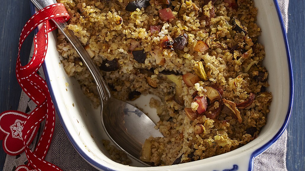 - Ochucené kroupy dáme do sádlem vymazaného pekáčku a na povrch položíme zbylé sádlo. Vložíme do trouby vyhřáté na 180 °C a zapečeme dozlatova.