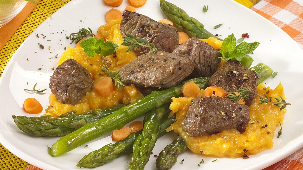 - Očištěné a omyté hovězí nakrájíme na kostky. Kostky osolíme, opepříme a na rozpáleném oleji opečeme. Zalijeme je vodou a dusíme doměkka.