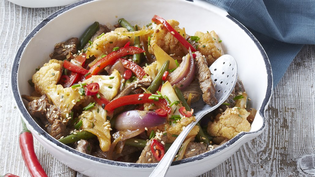 - Do pánve nalijeme olej a maso zprudka orestujeme. Přidáme cibuli, papriku, česnek, květák a opékáme vše asi 3 minuty. Přidáme fazolky, chilli papričku, prohřejeme, dochutíme sójovou a pikantní sladkokyselou omáčkou, pažitkou a sezamovým semínkem. Podáváme s dušenou rýží.