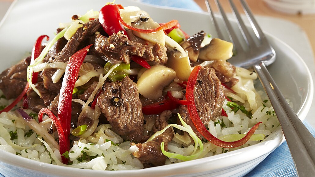 - Zakapeme sójovou omáčkou, zalijeme masovým bujónem a povaříme asi 10 minut. Nakonec vložíme chilli papričku a podle chuti můžeme přisolit. Podáváme s rýží.
