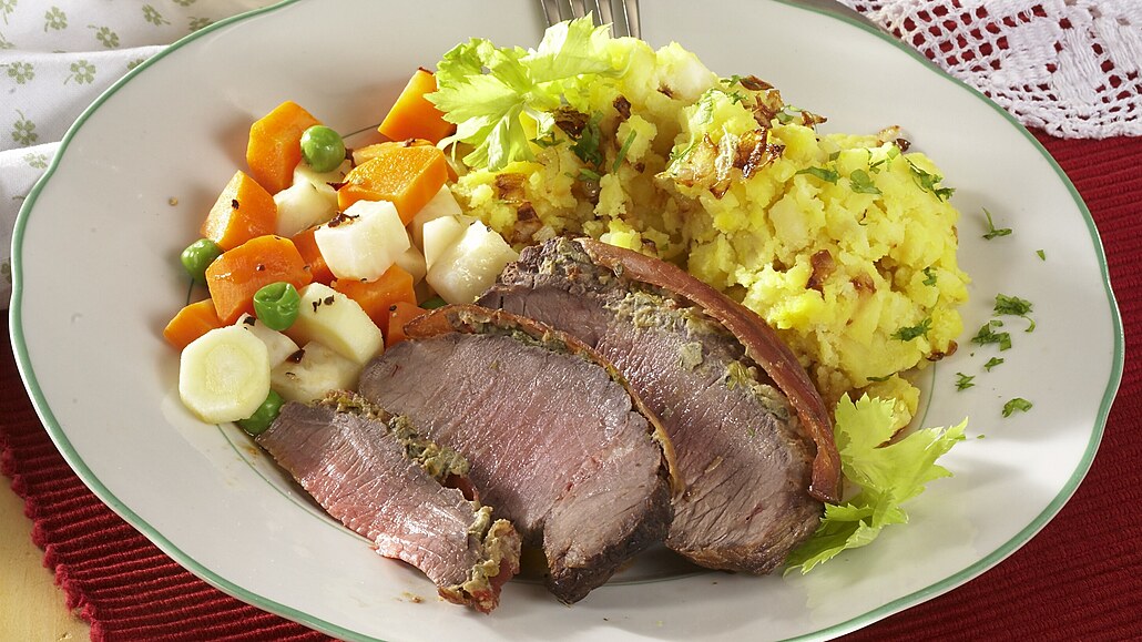 - Maso vyndáme a uchováme teplé. Šťávu přecedíme. Z pečeně odstraníme nit a nakrájíme ji na plátky. Podáváme se šťouchanými brambory, přelitými výpekem, a dušenou kořenovou zeleninou.