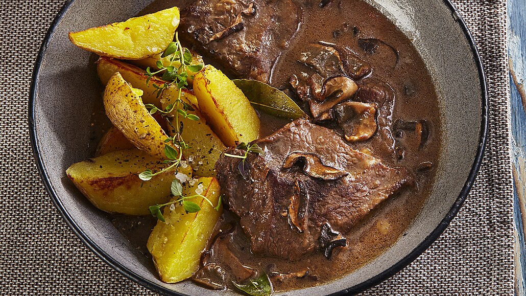 - Omáčku pak zjemníme smetanou a necháme přejít varem. Hotové maso s omáčkou můžeme podávat například s pečenými bramborami a tymiánem.