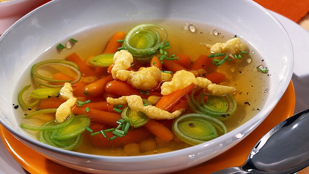 - Do vývaru přidáme očištěnou, na větší kusy nakrájenou mrkev a pórek a uvaříme doměkka.