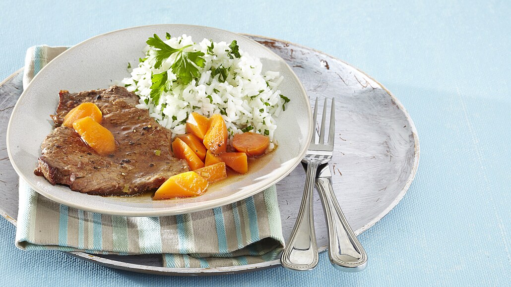 - K masu přidáme mrkev a podusíme ji na skus. Nakonec šťávu zahustíme škrobem rozmíchaným v troše vody a ještě krátce povaříme. Podáváme s petrželovou rýží.