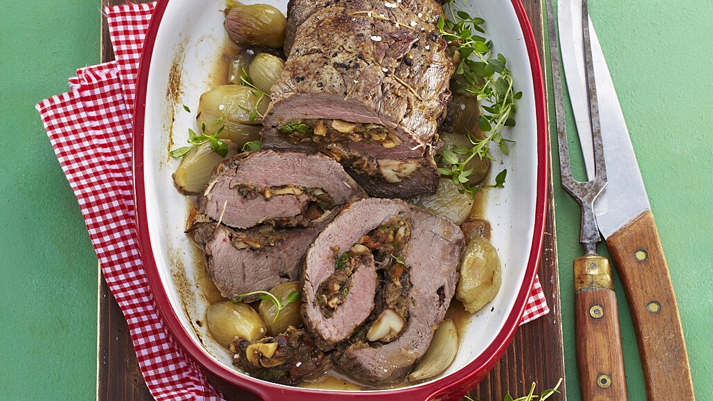 - Z vrchu ji osolíme a opepříme. Do pekáčku přidáme i zbylé oloupané šalotky a stroužky česneku. Navrch masové rolády dáme zbylé máslo nakrájené na kousky. Podlijeme trochou vody a pečeme ve vyhřáté troubě při 190 °C asi 40 minut. Během pečení podléváme vodou dle potřeby.