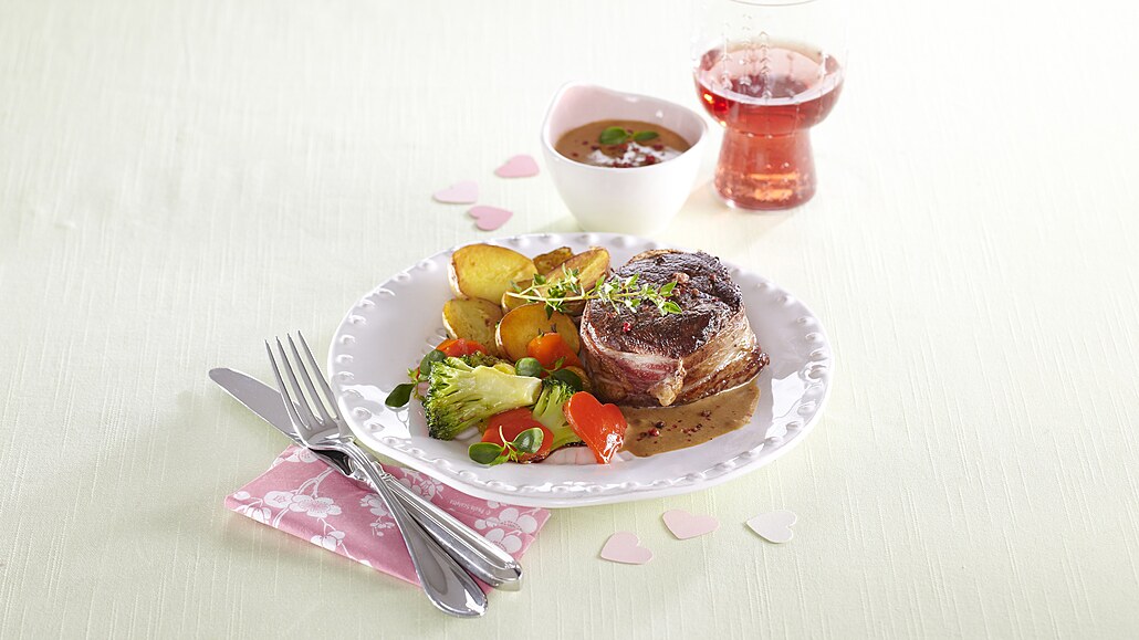 - Maso očistíme, omyjeme a nakrájíme na stejně velké steaky, které po obvodu obalíme plátky pancetty a převážeme provázkem. Osolíme je a opepříme.