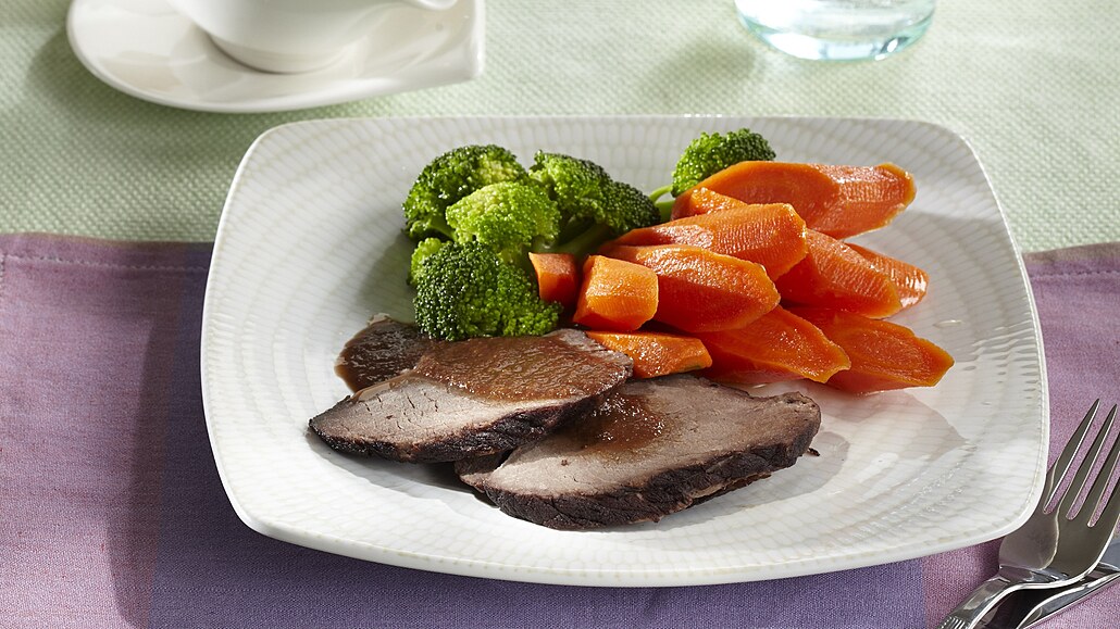 - Měkké maso vyjeme z hrnce a nakrájíme na plátky. Omáčku propasírujeme nebo rozmixujeme. Dochutíme ji solí, pepřem a muškátovým oříškem a dle potřeby dosladíme. Hovězí podáváme přelité omáčkou, s vařeným brambory a zeleninou.