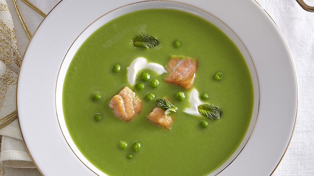 - Dochutíme solí a čerstvě mletým pepřem a vaříme asi 10 minut. Zbylý hrášek orestujeme na másle a přidáme do polévky.