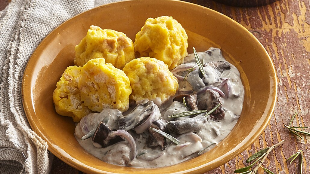 - Knedlíčky: Housky nakrájíme na drobné kostičky. V míse rozmícháme mléko s vejcem, přidáme mouku a sůl a opět promícháme. (Těsto by mělo mít konzistenci jako hustší těsto na palačinky). Vmícháme kostičky housky.