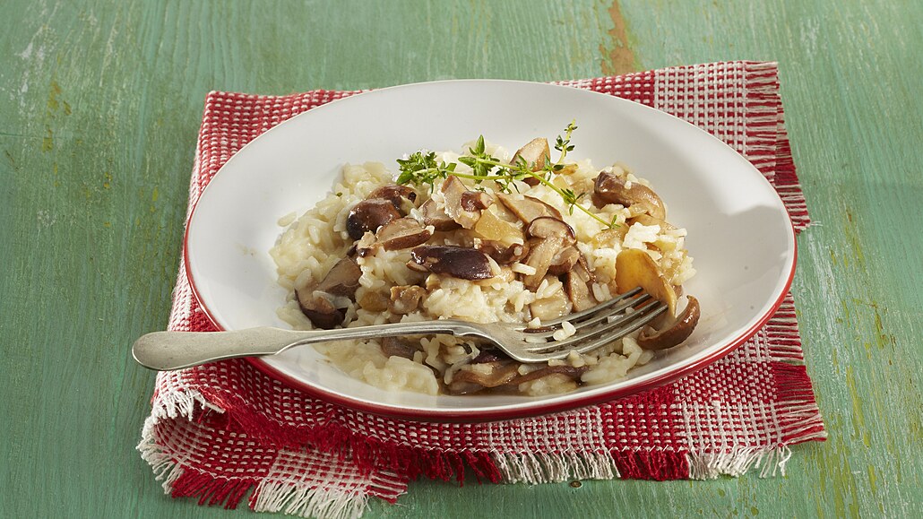- Rizoto odstavíme, na závěr přimícháme máslo a parmezán. Před podáváním dozdobíme snítkami tymiánu.