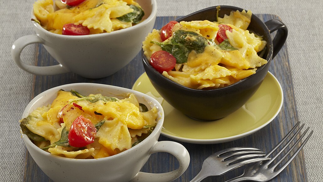 - Nakonec přimícháme zbylý nastrouhaný sýr, rajčata a špenát. Těstoviny s omáčkou a zeleninou dáme do hrníčků na zapékání. Vložíme je do trouby a pečeme při 200 °C asi 10 minut.