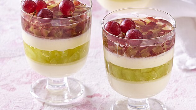 - Zelené hroznové víno nakrájíme na velmi malé kousky. Dortové želé uvaříme podle návodu na obalu. Část želé smícháme se zeleným vínem a rozlijeme do skleniček se zatuhlou první vrstvou panna cotty. Necháme ztuhnout. Pak nalijeme zbylou panna cottu a necháme ztuhnout.