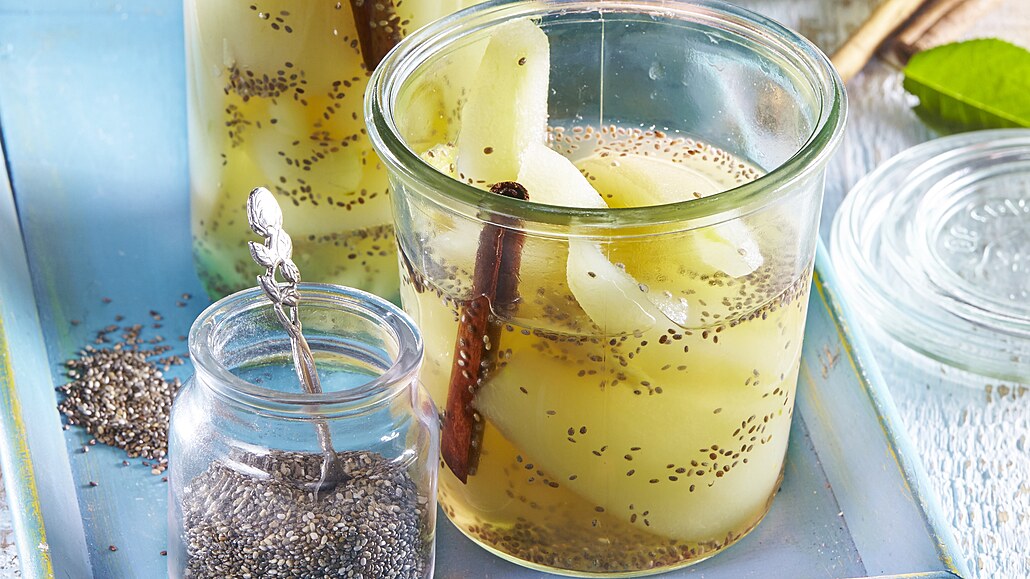 - Pak hrušky vyjmeme a naskládáme je do skleniček, do každé rozdělíme povařenou skořici, hřebíček a zázvor. Do vinného nálevu vmícháme chia semínka a zalijeme jím hrušky ve sklenicích.