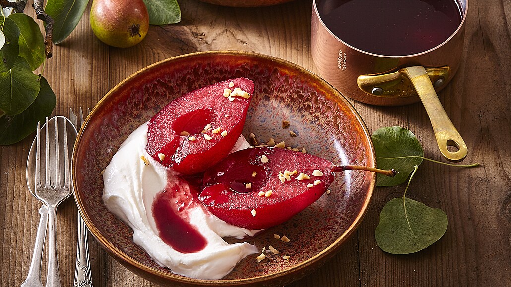 - Mascarpone smícháme se zakysanou smetanou a cukrem. Hrušky dáme na talířky, přidáme krém, polijeme nálevem a podáváme vychlazené.