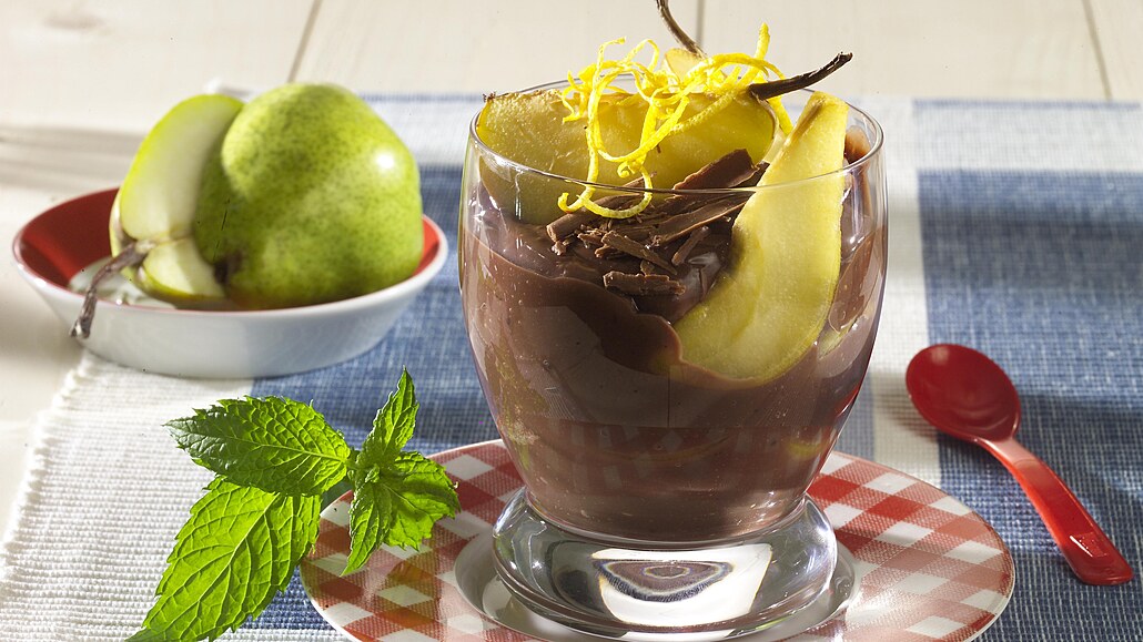 - Poháry střídavě plníme plátky hrušek a pudinkem, až jsou zcela plné. Ozdobíme nudličkami citronové kůry, lístečky máty a podáváme.