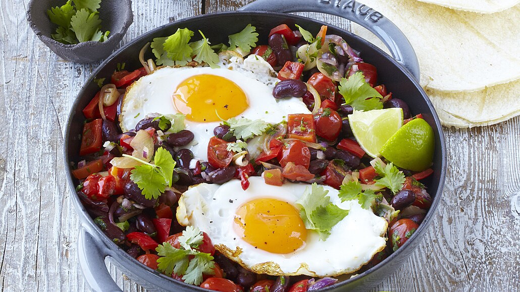 - Do pánve nalijeme zbylý olej a orestujeme na něm papriku s cibulí, česnekem a chilli. Pak vmícháme fazole s rajčaty a společně ještě krátce restujeme. Nakonec dochutíme solí, pepřem a koriandrem. K zelenině vložíme hotová vejce a krátce prohřejeme.