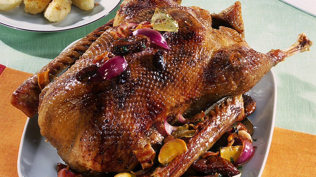 - Nakonec přidáme do pekáče zbývající ovoce a med a pečeme zvolna půl hodiny. Měkkou husu vyndáme z pekáče, výpek vydusíme do tuku, zaprášíme moukou, orestujeme, zalijeme zbylým vývarem, smetanou a provaříme. Mezitím husu naporcujeme, přendáme zpět do pekáče a necháme v troubě ještě asi 15 minut dojít. Husu podáváme s bramborovým knedlíkem nebo kroketami, porce poléváme šťávou s ovocem.