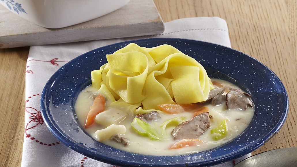 - Nakonec do hrnce vložíme pokrájené, očištěné drůbky a vše dochutíme muškátovým květem, citronovou kůrou a solí. Podáváme se širokými nudlemi.