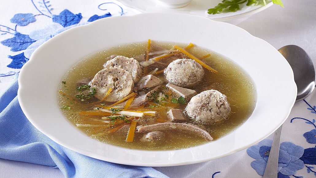 - Mezitím si připravíme játrové knedlíčky. Vejce utřeme s máslem, přidáme očištěná umletá játra a ochutíme utřeným česnekem, majoránkou, solí a bílým pepřem. Podle potřeby zahustíme strouhankou a vytvarujeme malé knedlíčky. Vkládáme je do vroucí osolené vody a uvaříme.