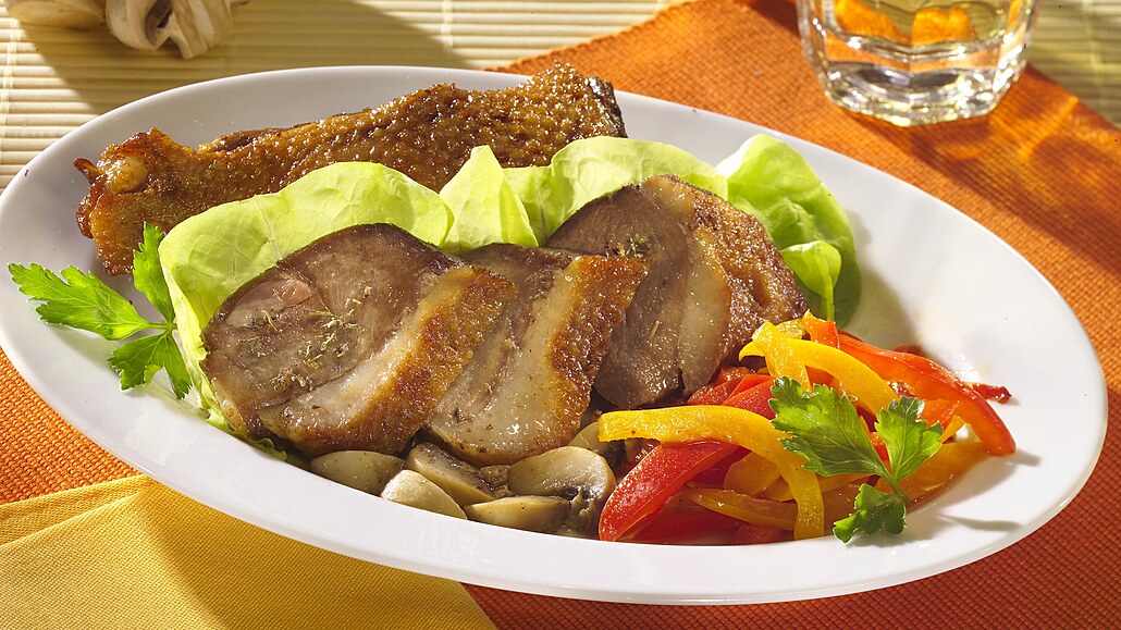 - Maso rozdělíme na talíře, ozdobíme na nudličky nakrájenou a orestovanou paprikou a hlávkovým salátem. Přelijeme šťávou se žampiony a podáváme.