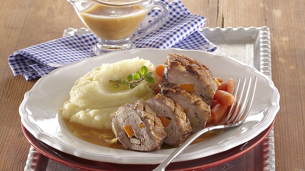 - Pečená husí prsa vyjmeme a výpek vyrestujeme na tuk. Zaprášíme ho moukou a zalijeme vývarem. Provaříme a dochutíme solí a pepřem. Pečená prsa nakrájíme na plátky a podáváme s baby karotkou a bramborovou kaší.