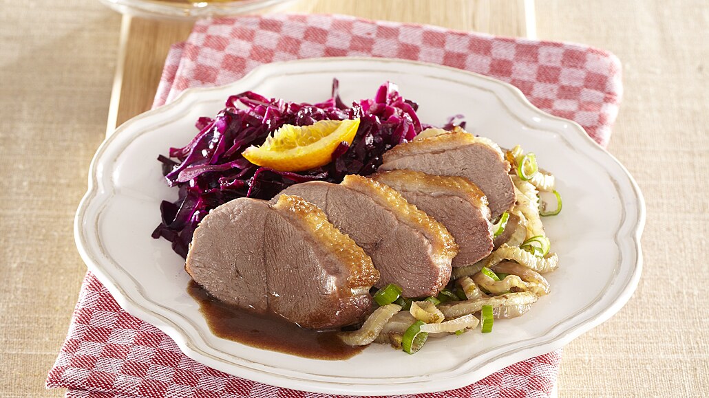 - Pak husí prsa opečeme zprudka na dvou lžících rozehřátého oleje. Přidáme fenykl, zalijeme červeným vínem a v předehřáté troubě při 200 °C dopečeme doměkka.