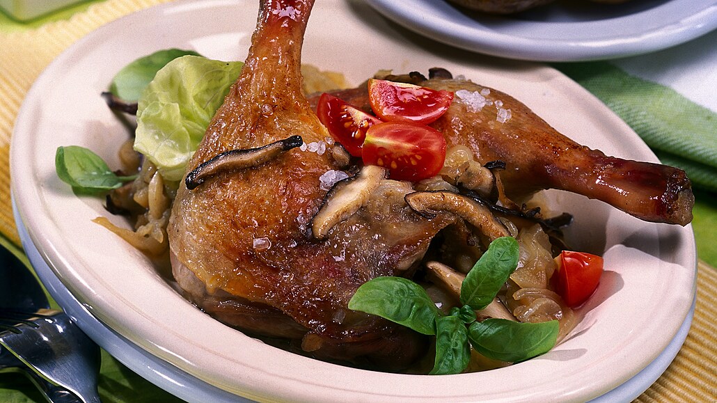 - Orestovanou cibuli s česnekem přendáme do pekáče a rozložíme na ně husí stehna. Vše podlijeme trochou drůbežího vývaru a vložíme do trouby. Stehna při 180 °C pečeme asi 60 minut. Během pečení přeléváme maso vypečenou šťávou. Pokud je to nutné, odebíráme z pekáče přebytečný tuk.