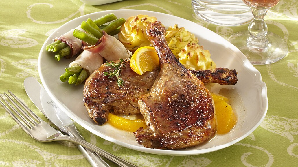 - Hotová stehna vyjmeme z pekáčku. Šťávu přecedíme. Přidáme k ní sádlo, rozředíme ji vývarem a zahustíme ji moukou rozmíchanou v troše vody. Asi 15 minut ji povaříme. Před koncem do ní přidáme filátka z pomeranče a dochutíme ji solí, pepřem a cukrem.