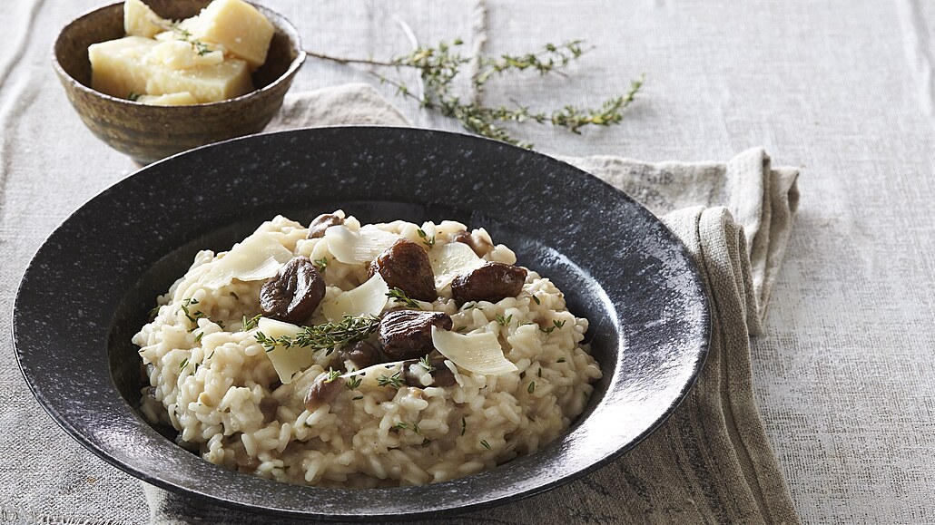- Na závěr do rizota vmícháme studené máslo a dle chuti dosolíme. Rizoto podáváme ozdobené kaštany, které předtím opečeme na olivovém oleji. Posypeme hoblinkami parmazánu a tymiánem.