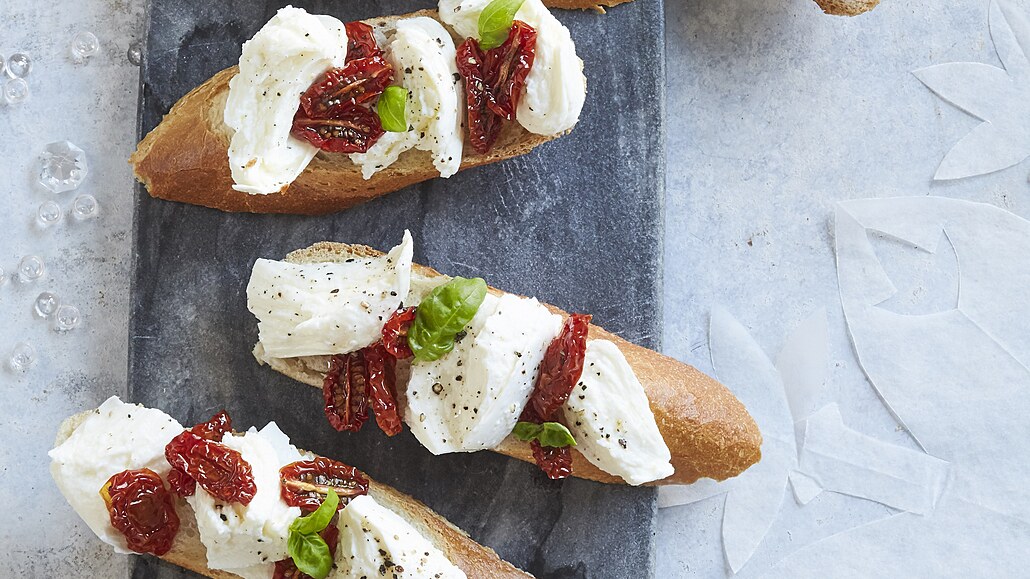 - Ciabatty nakrájíme na plátky, poklademe je na kousky natrhanou nebo nakrájenou mozzarellou a doplníme naloženými rajčaty. Nakonec vše osolíme a opepříme a dozdobíme lístky bazalky.
