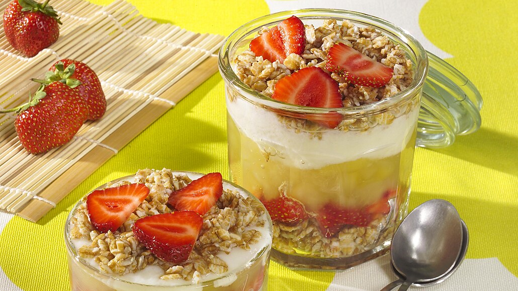 - Do připravených skleněných misek postupně vrstvíme vychladlé ovesné vločky, jahody, ovocnou přesnídávku a bílý jogurt. Navrch nasypeme ještě trochu ovesných vloček a ozdobíme kousky čerstvého ovoce.
