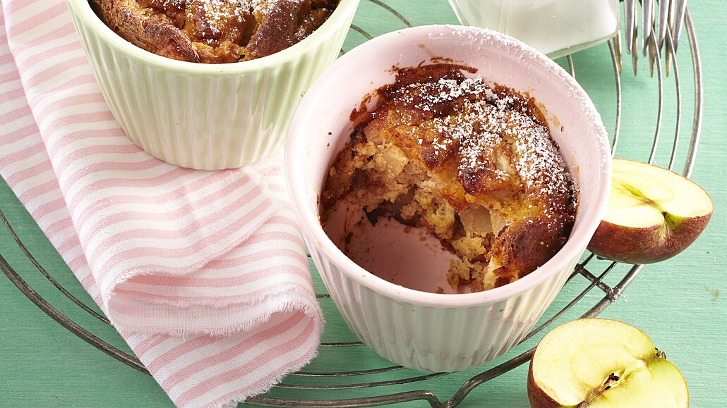 - Misky vložíme do trouby předehřáté na 180 °C a zapékáme asi 25 minut dozlatova. Necháme vychladnout a před podáváním posypeme moučkovým cukrem.