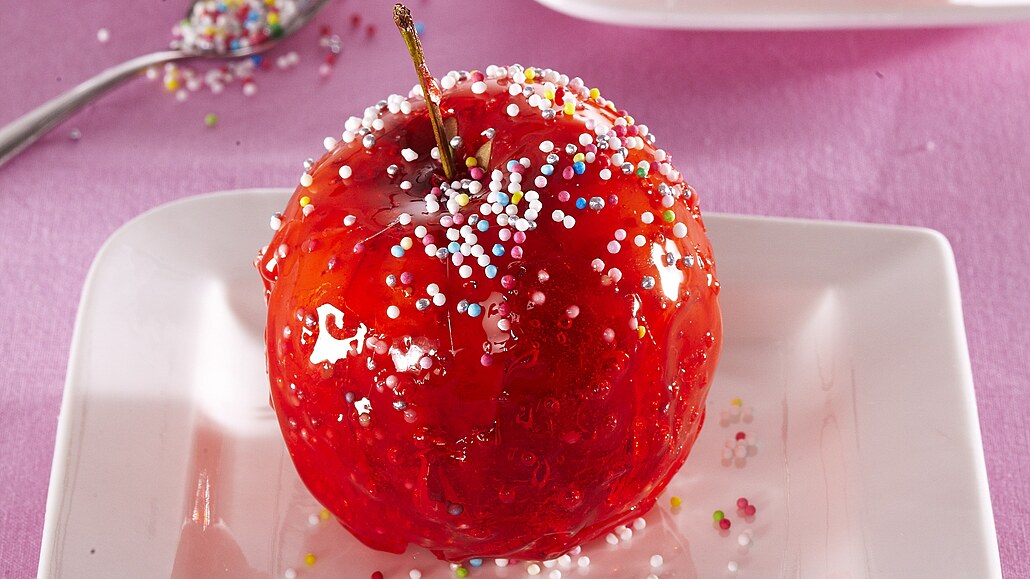 - Jablka omyjeme a dobře osušíme. Postavíme je na plech potřený olejem a přelijeme je karamelem. Ihned je posypeme cukrovým máčkem a necháme je stát, dokud poleva neztuhne.